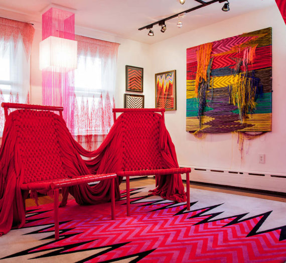 Son travail est un mélange de peinture, de dessin et de tissage.