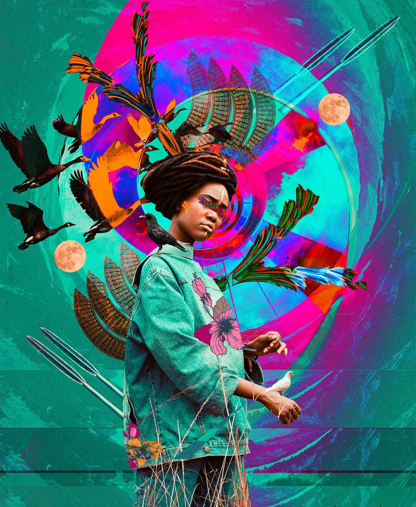 Kaylan Michel est une artiste et graphiste canadienne. Dans sa vision afro futuriste, la femme noire occupe une place centrale. Elle travaille principalement sur ordinateur pour concevoir des collages digitaux. Elle y explore les thèmes de la spiritualité, de la féminité et prône l’empowerment et le retour à ses racines africaines. Son style est d’une esthétique visuellement stimulante, dans lequel se développe un univers psychédélique aux couleurs vives et aux détails étonnants, parmi lesquels on retrouve systématiquement la soucoupe volante ou un oiseau porteur de symbole.